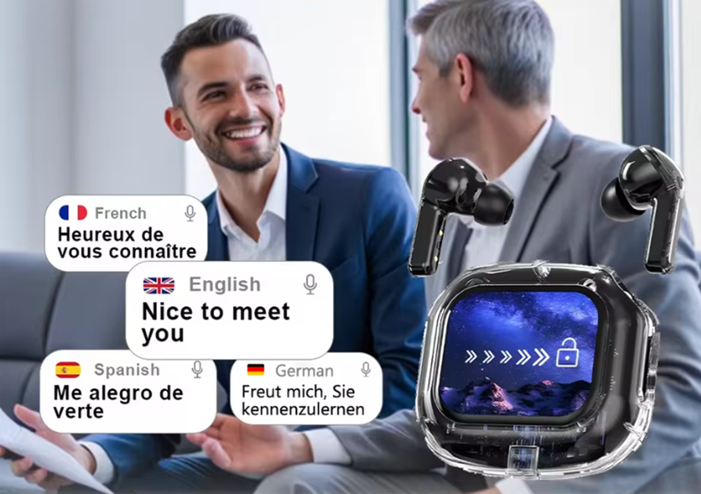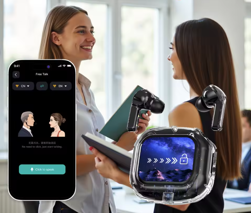 TalkEar se connecte à une application mobile (iOS / Android) qui utilise l’intelligence vocale pour traduire vos conversations en temps réel. Vous parlez dans l’écouteur, et la traduction est diffusée instantanément à votre interlocuteur.